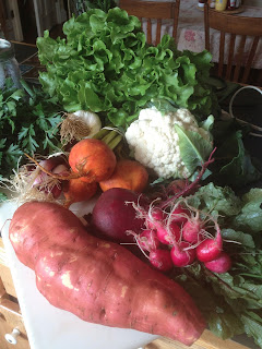 Some may think, “well what in God’s name am I going to make with that collection of ingredients?” But it’s not that hard at all. Eating seasonally can be a fun, creative, and ultimately delicious culinary challenge. If we were signed up for Option 3 in our box there’s cabbage, beets, garlic, scallions, and a chicken breast. I’m feeling a borscht-like kind of stew with pieces of grilled or sautéed chicken coming on. Voila!